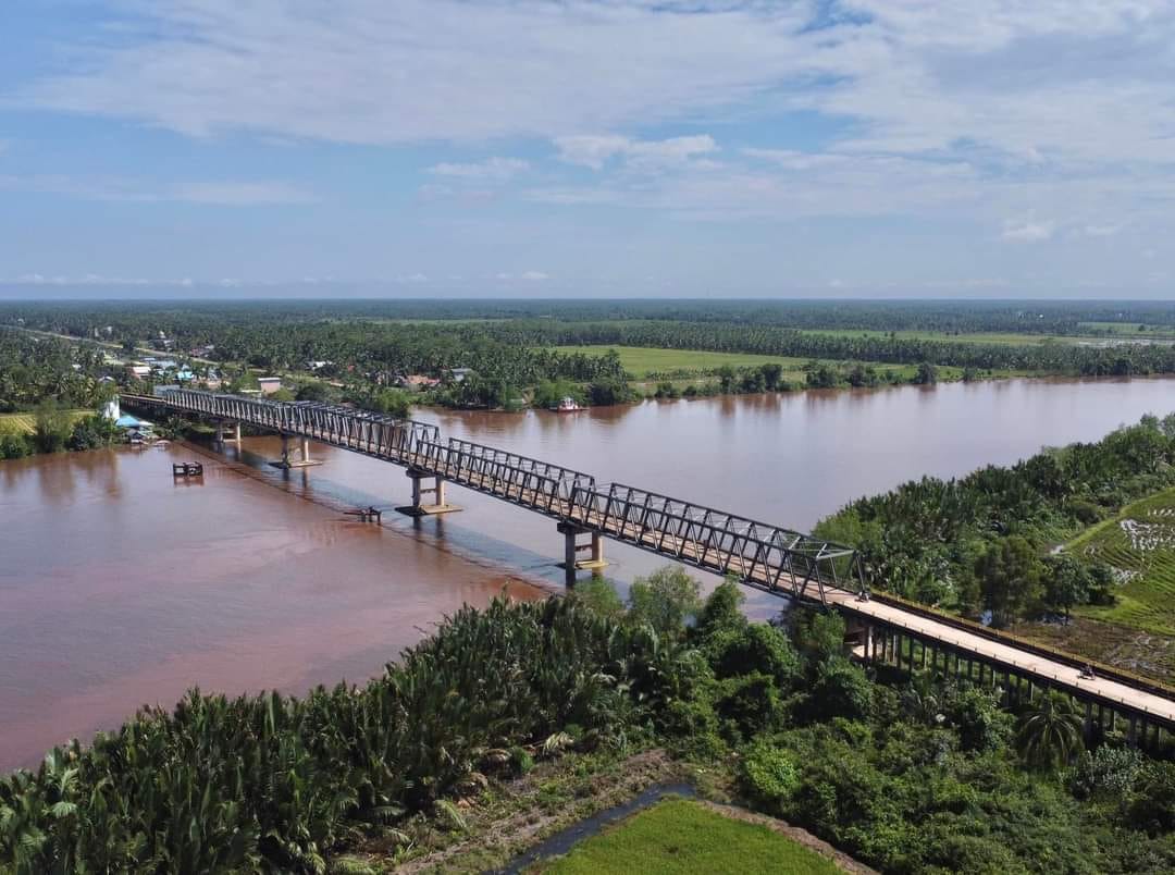 Jembatan penghubung sangat cocok untuk di jadikan spot untuk berfoto dengan pemandangan sungai dan persawahan.